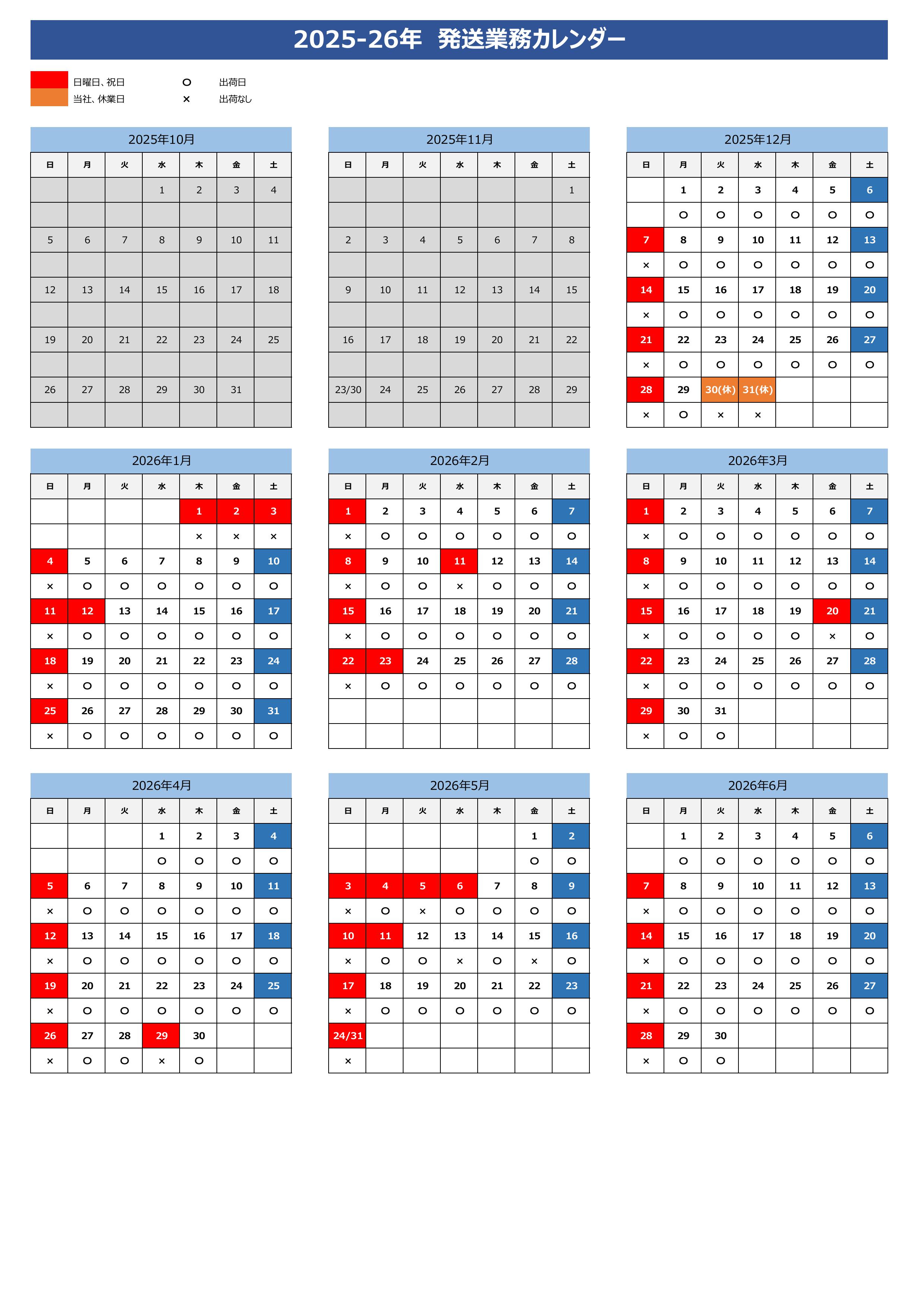 発送作業と発送業務カレンダー(2026)■出荷依頼と発送日営業日の17時までの出荷依頼を翌営業日に発送します。※金曜日の17時以降の出荷依頼は翌営業日(月曜日)の発送となりますので、ご注意ください。■郵便での発送の注意事項・土日祝日は郵便局が集荷、窓口受付、配送を行っていません。・定形・定形外郵便、国際郵便は、平日の発送となります。・発送件数が多く、窓口受付での発送となる場合は、窓口営業日での発送となります。■発送業務カレンダー