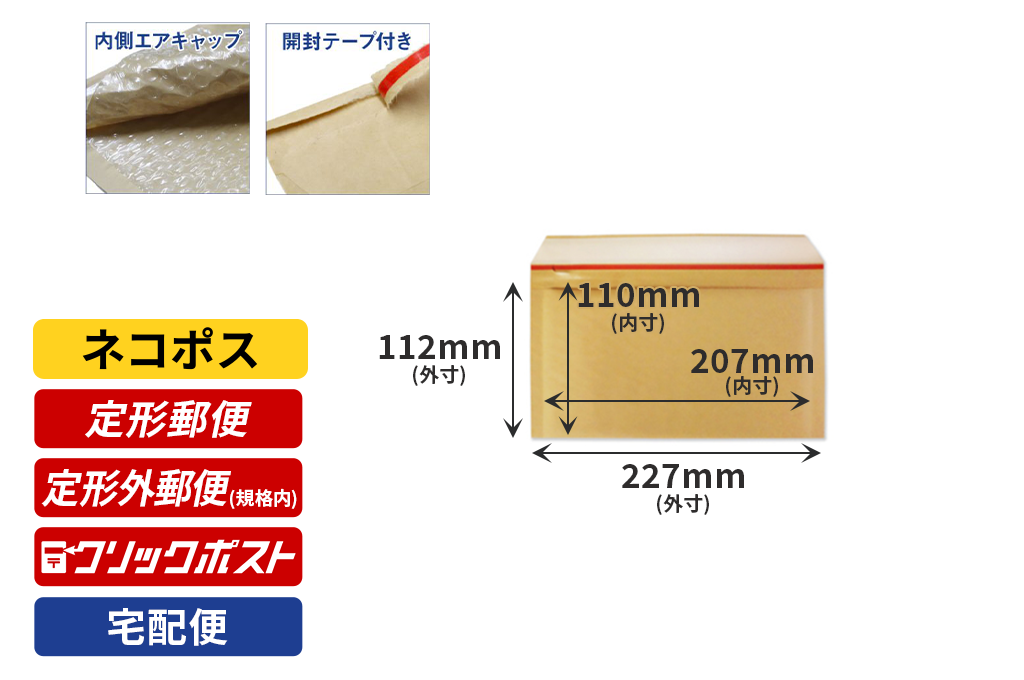 ![]() | クッション封筒(小) 弊社準備汎用品 | 内寸:207×112mm 外寸:227×112mm 重量:10g | 17円~/枚 |