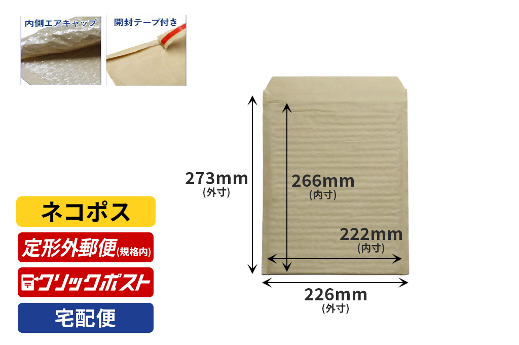 | クッション封筒 227×112 | クッション封筒 273×226 | クッション封筒 335×245 | 紙封筒 330×240 |