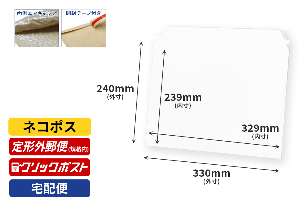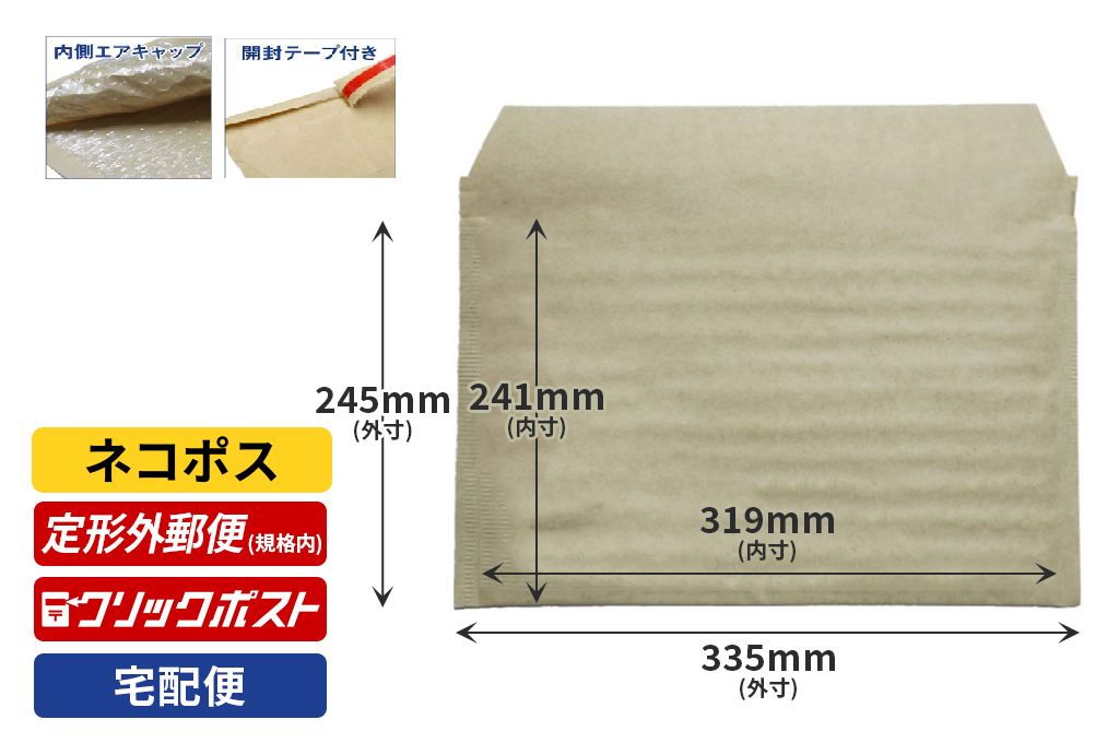 ![]() | クッション封筒(大)弊社準備汎用品 | 内寸:319×241mm 外寸:335×245mm 重量:24g | 26円~/枚 |