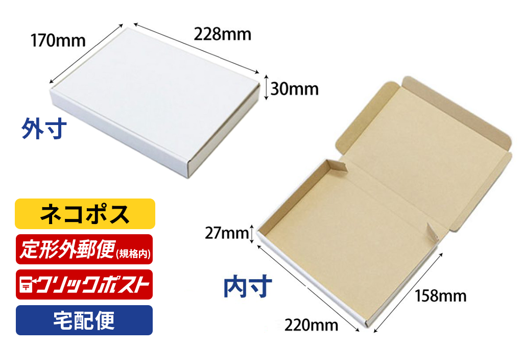 ![]() | クリックポスト対応箱(中)弊社準備汎用品 | 内寸:220×158×27mm 外寸:228×170×30mm 重量:55g | 30円~/枚 |