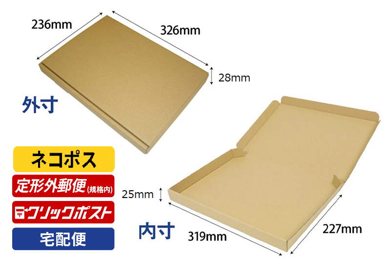 ![]() | クリックポスト対応箱(大)弊社準備汎用品 | 内寸:319×227×27mm 外寸:326×236×30mm 重量:105g | 40円~/枚 |